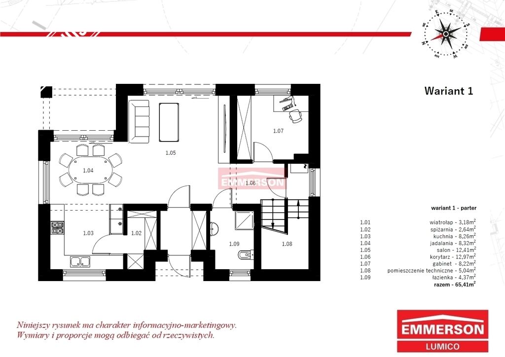 pomieszczenie techniczne - 5,04m2 łazienka - 4,37m2 razem - 65,41m2